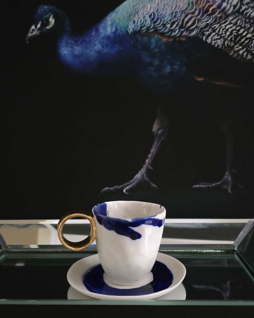 Design: Filiżanka o pojemności 60 ml urzeka połączeniem klasycznej bieli z głębokim kobaltowym odcieniem, który przywodzi na myśl bezkresny kosmos. Delikatne, nieregularne kobaltowe plamy zdobią zarówno filiżankę, jak i spodek, nadając im unikalny charakter. Wnętrze filiżanki ozdobione jest subtelnymi kropkami z 24-karatowego złota, które dodają jej blasku i luksusowego akcentu. Złote uszko idealnie dopełnia całość, podkreślając wyjątkowy charakter naczynia.