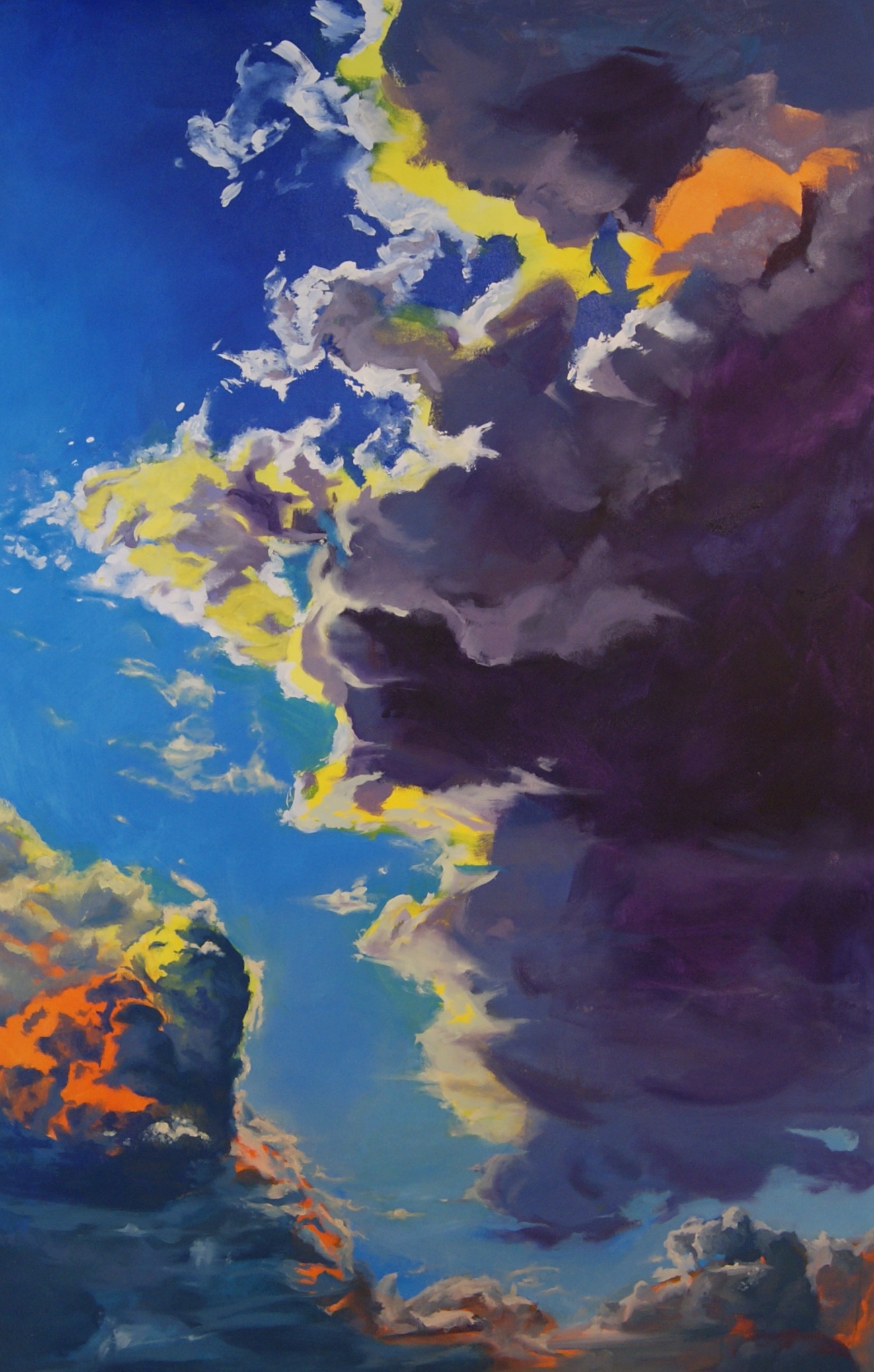 W obrazie „Chmury 1” Maja Waśkowiak znakomicie wykorzystuje dynamikę plam barwnych do stworzenia silnego napięcia emocjonalnego. Chociaż z prawej strony płótna napiera na nas front ciężkich, mrocznych, fioletowo-granatowych mas chmur, będący ucieleśnieniem niepokoju i nadchodzącej zmiany, jednak to raczej lewa strona kompozycji stanowi o unikalności tego dzieła. Obecne tu łagodniejsze błękity, a przede wszystkim żółto-pomarańczowe błyski słońca otwierają przed widzem zupełnie inną perspektywę – symbolizują przełamanie, które następuje w samym centrum konfliktu.