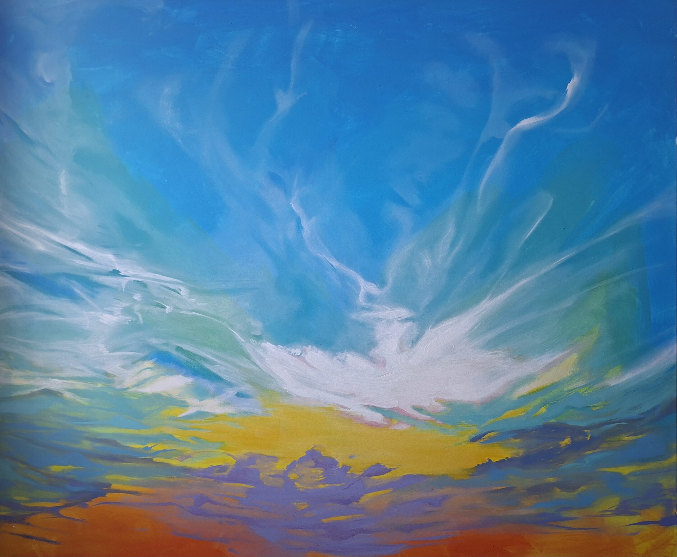 W obrazie „Chmury 2” Maja Waśkowiak demonstruje rzadko spotykaną u artystek młodego pokolenia swobodę gestu, która nadaje kompozycji niezwykłą siłę wyrazu. Na płótnie o wymiarach 180×150 cm nie odnajdziemy śladu wymuszenia czy niepewności; wręcz przeciwnie – autorka operuje szeroką, pewną plamą, która wciąga widza w bezkresny, podniebny teatr. Bohaterem kompozycji są chmury typu Cirrus (Ci), których włóknista, przypominająca ptasie pióra struktura, stała się dla artystki pretekstem do stworzenia pracy o wyjątkowym rozmachu.