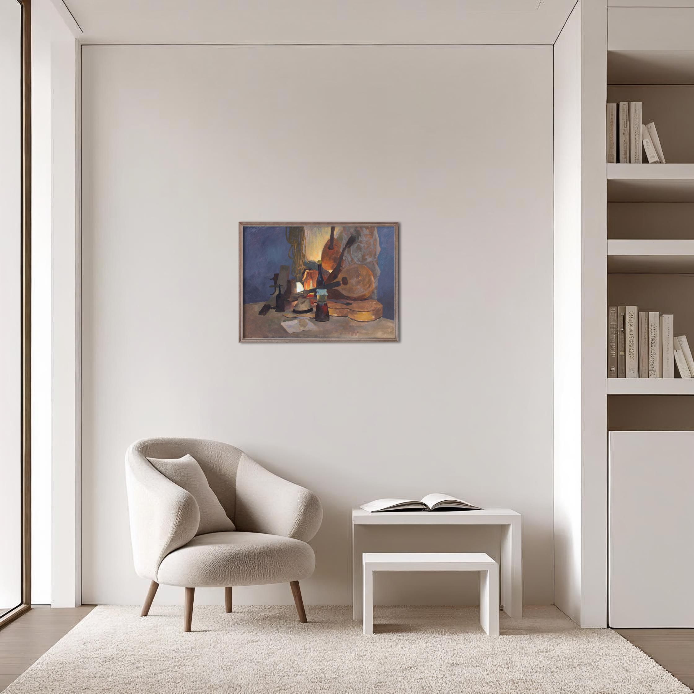 Temat i Styl: Chociaż obraz nawiązuje do bogatej tradycji tego gatunku, Małgorzata Jakieła podchodzi do tematu z własną wrażliwością. Obraz przedstawia zgromadzone na blacie instrumenty muzyczne – widoczne są mandoliny i gitary, w otoczeniu innych przedmiotów. Styl malarski Jakieły jest wyraźnie rozpoznawalny: widać tu solidne podstawy techniczne i intuicyjne podejście do koloru. Faktura farby jest zróżnicowana, choć dominują płaskie, szerokie pociągnięcia pędzla, które budują bryły i formy, nadając im solidności.