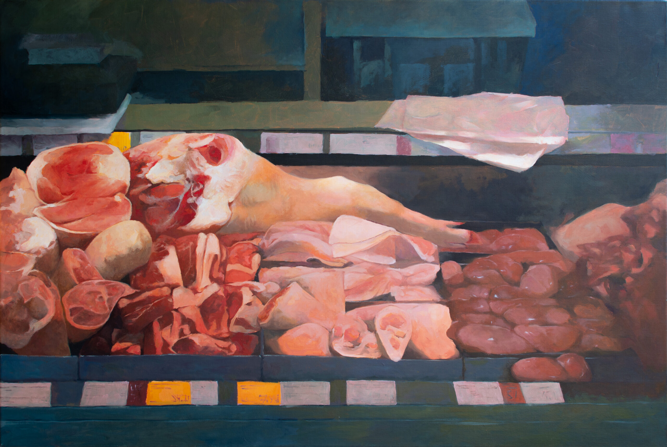 Temat i styl: Obraz przedstawia ekspozycję mięsa na ladzie chłodniczej, prawdopodobnie w sklepie mięsnym lub na lokalnym targu. Widoczne są różnorodne kawałki mięsa, w tym duży fragment z kością i skórą, oraz mniejsze, pokrojone porcje. Temat jest odważny, trudny i mało konwencjonalny dla martwej natury, zwłaszcza w kontekście pracy dyplomowej. Styl obrazu jest realistyczny, z wyraźnym malarskim zacięciem. Widać silne zainteresowanie formą, teksturą i sposobem, w jaki światło wpływa na kolorystykę i bryłę.