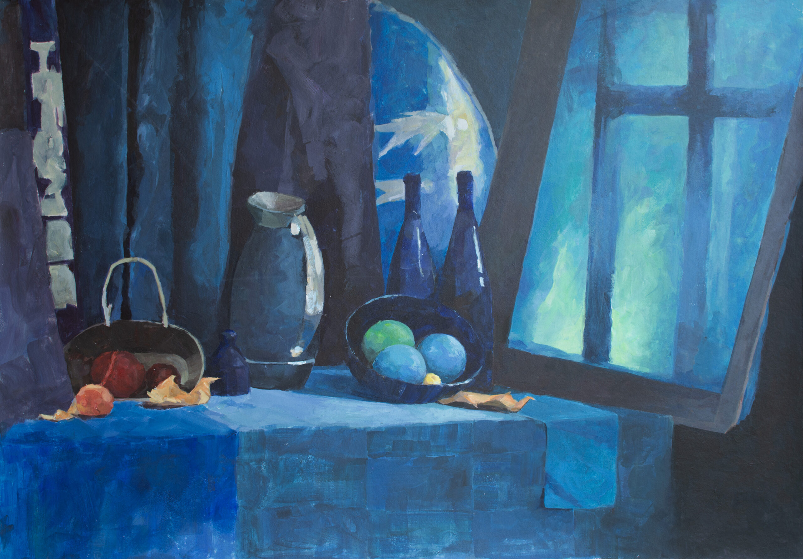 Wstęp: Obraz „Niebieska martwa natura” Małgorzaty Jakieły, wykonany techniką akrylu na zagruntowanej tekturze (100×70 cm, 2023), stanowi kolejny dowód na wszechstronność i talent młodej artystki w eksplorowaniu klasycznych motywów malarskich. Po ciepłych kompozycjach „Czerwonej” i „Zielonej martwej natury”, praca ta przenosi widza w zupełnie inny świat barw i nastrojów, jednocześnie kontynuując jej zainteresowanie studium światła, formy i kompozycji.