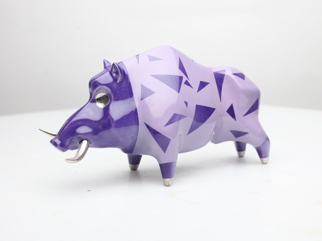 Wykonana podszkliwnie malatura figurki jest bardzo ciekawa: korpus w jaśniejszym odcieniu fioletu jest pokryty trójkątami o różnych walorach tego koloru, a głowa jest ciemnofioletowa. Szable (kły) i kopyta dzika są dodatkowo posrebrzane.