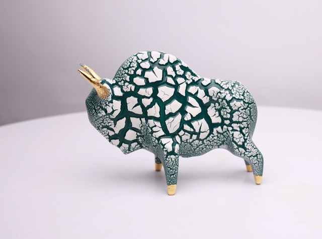 “Żubr L model Green Snake” Mariusza Dydo to coś więcej niż rzeźba – to spektakularny manifest artystyczny, który redefiniuje obecność sztuki figuratywnej we współczesnym domu. Obiekt ten jest doskonałym przykładem synergii między monumentalną bryłą żubra a finezyjnym, niemal jubilerskim detalem powierzchni. Rzeźba zachwyca syntetyczną formą. Artysta zrezygnował ze zbędnych szczegółów anatomicznych na rzecz geometryzacji sylwetki, co nadaje żubrowi monumentalności i nowoczesnej elegancji. Kluczowym elementem jest autorski wzór “Green Snake”.