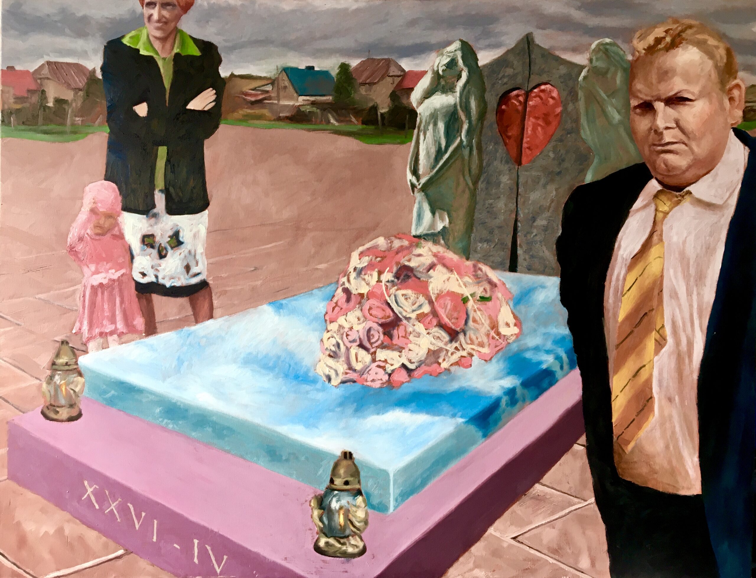 Wstęp: Tematyka obrazu “Grobowiec” Mateusza Drozdowskiego oscyluje wokół uniwersalnego motywu śmierci i żałoby, jednak w interpretacji artysty zyskuje on wymiar bardziej złożony, dotykając współczesnych postaw wobec tych doświadczeń. Obraz przedstawia scenę na cmentarzu, gdzie zgromadzone przy tytułowym grobowcu osoby w różny sposób manifestują swoje emocje i podejście do sytuacji. Artysta nie stroni przy tym od pewnych uproszczeń i swobody w traktowaniu detali, co nadaje obrazowi współczesny charakter.