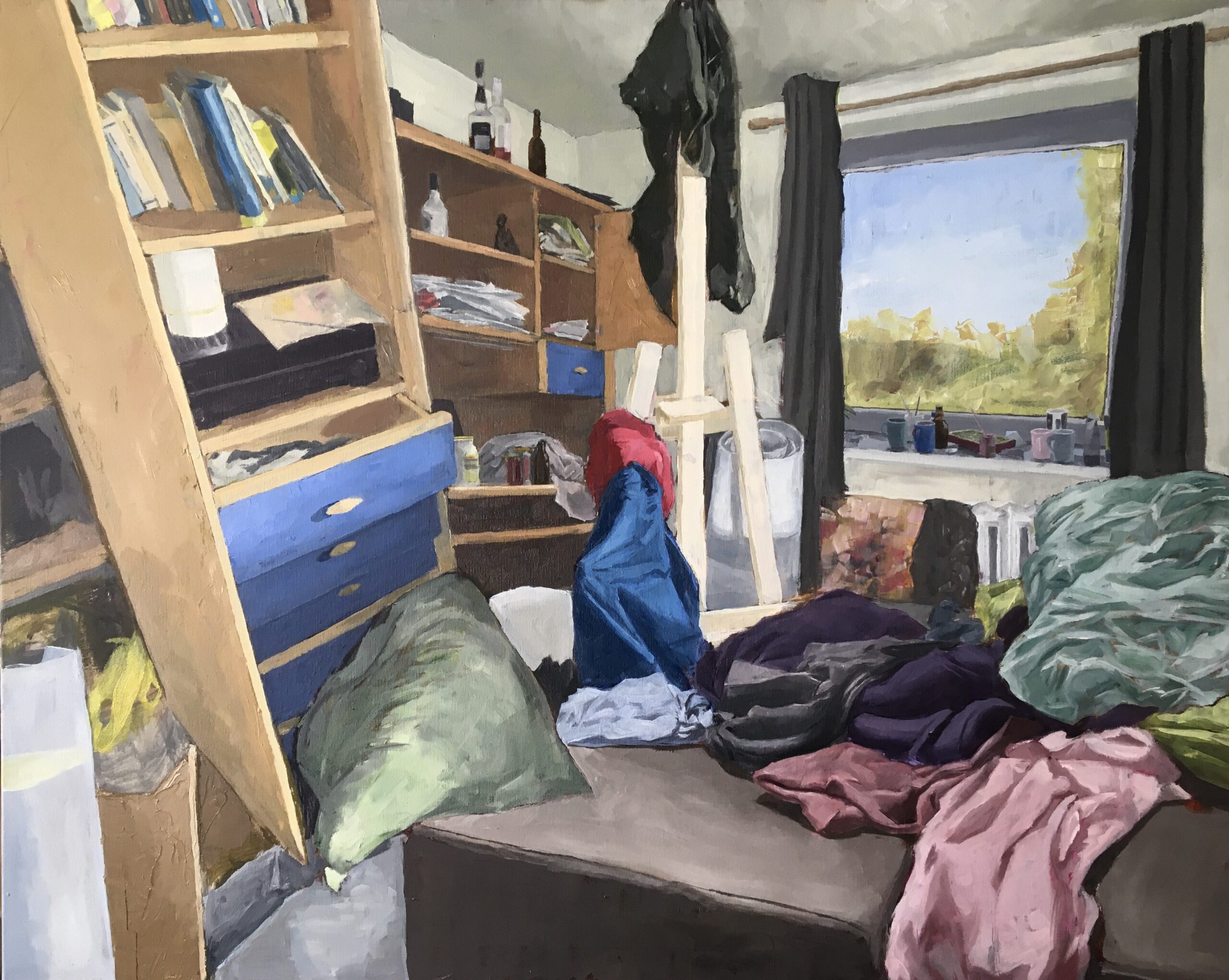 Wprowadzenie: Obraz “Wnętrze pokoju” Mateusza Drozdowskiego to studium przestrzeni prywatnej, wykonane w konwencji współczesnego realizmu. Artysta przedstawia widok pokoju – prawdopodobnie własnej pracowni lub przestrzeni życiowej – charakteryzującego się “twórczym” nieładem.
