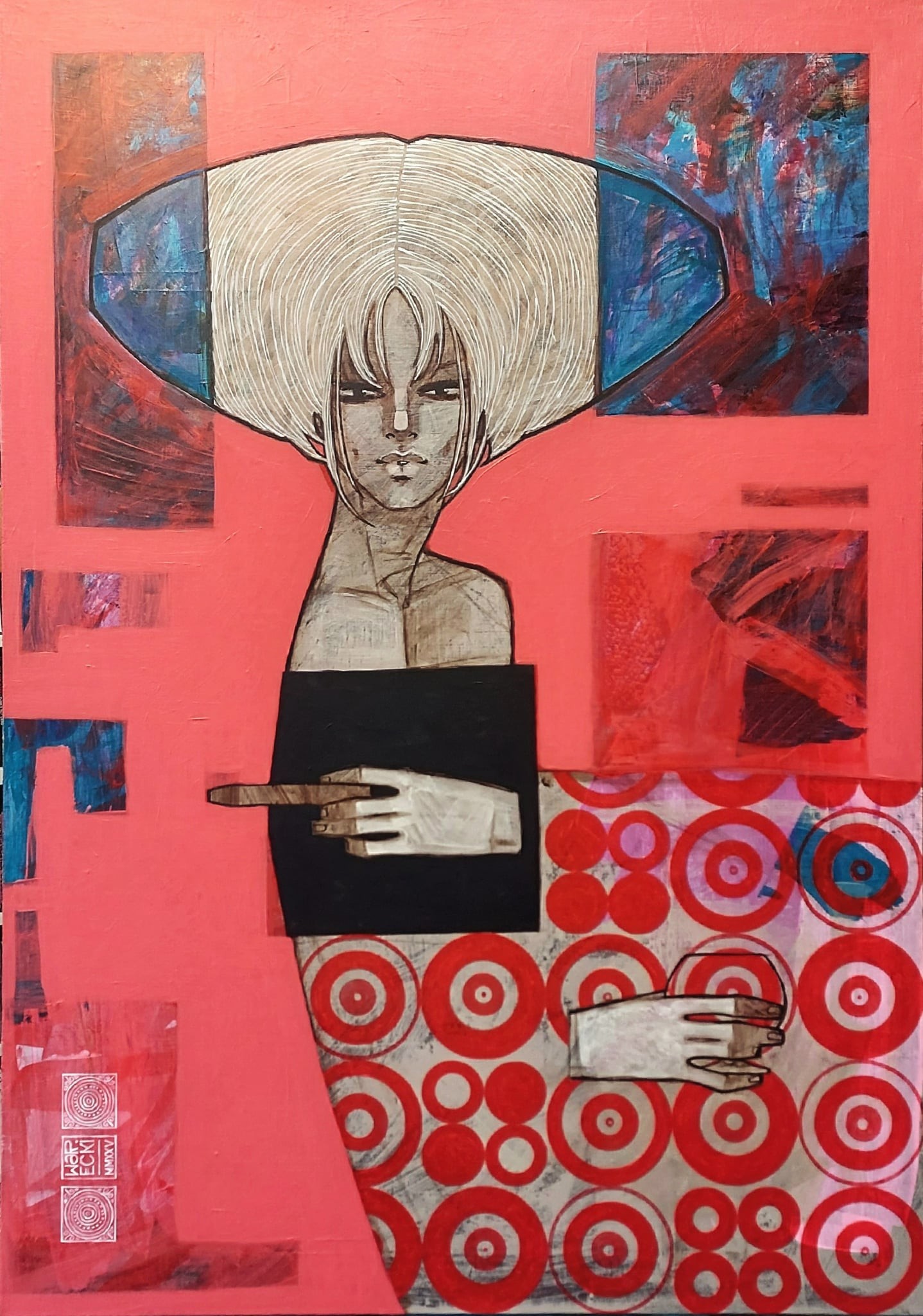 “Cygaro” to portret o dużej sile oddziaływania i symbolicznej wymowie. Dzieło Wareckiego operuje na przecięciu estetyki graficznej i ekspresyjnego malarstwa, tworząc postać, która manifestuje władzę i niezależność. Kompozycja jest zdominowana przez ciepłą, nasyconą czerwień tła, która nadaje scenie teatralny i pasjonujący charakter. Postać kobiety jest geometrycznie uproszczona, lecz jej twarz, malowana w technice grisaille (monochromatyczne szarości/brązy), stanowi centrum psychologiczne. Kontrast między graficzną czernią ubrania a hipnotycznym, abstrakcyjnym wzorem okręgów na sukni postaci w dolnej części obrazu (które mogą symbolizować cel, powtarzalność lub modowy print) jest kluczowy dla dynamiki wizualnej. Długie, jasne włosy, przypominające perukę, stanowią niemal koronę lub nimb, ikonizując postać.