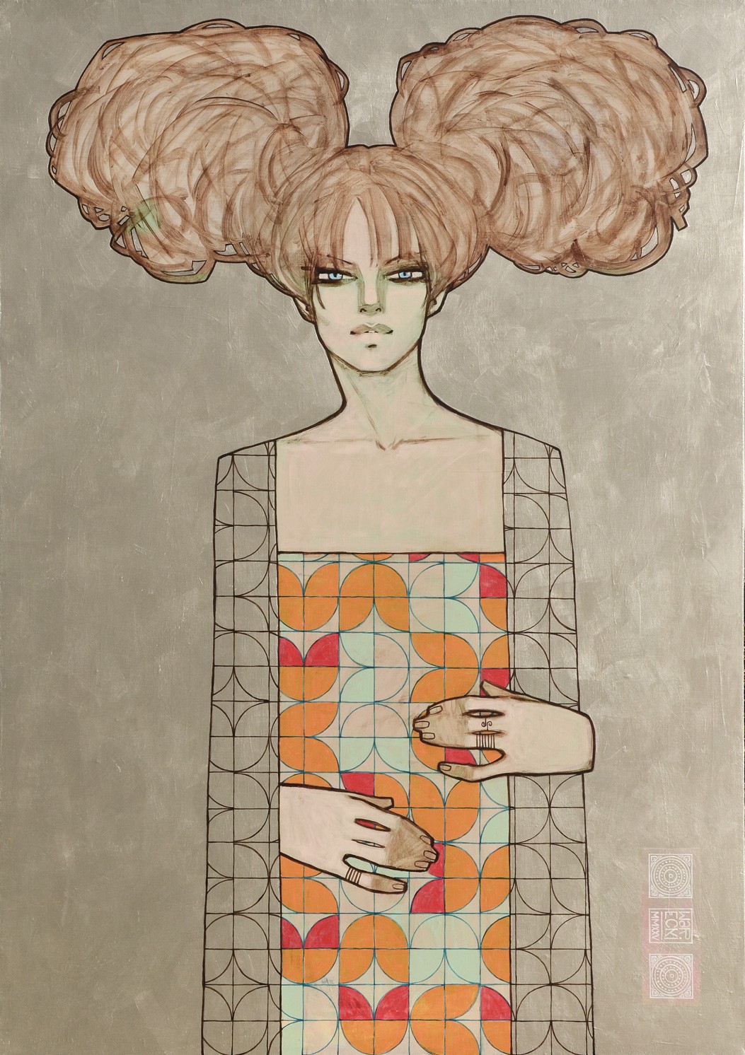 Inspiracja estetyką secesji, a w szczególności złotym okresem twórczości Gustava Klimta, jest tu ewidentna, lecz przefiltrowana przez nowoczesną wrażliwość. Srebrzysta, metaliczna płaszczyzna tła odrealnia postać, nadając jej charakter bizantyjskiej ikony, podczas gdy bujna, niemal architektoniczna fryzura dominuje nad kompozycją, budując monumentalizm sylwetki. Centralny pas ornamentu, złożony z geometrycznych motywów roślinnych i linearnych podziałów, stanowi serce obrazu – to tutaj malarz uprawia wyrafinowaną grę rytmów, która kojarzy się z dekoracyjnością tkanin fin de siècle.