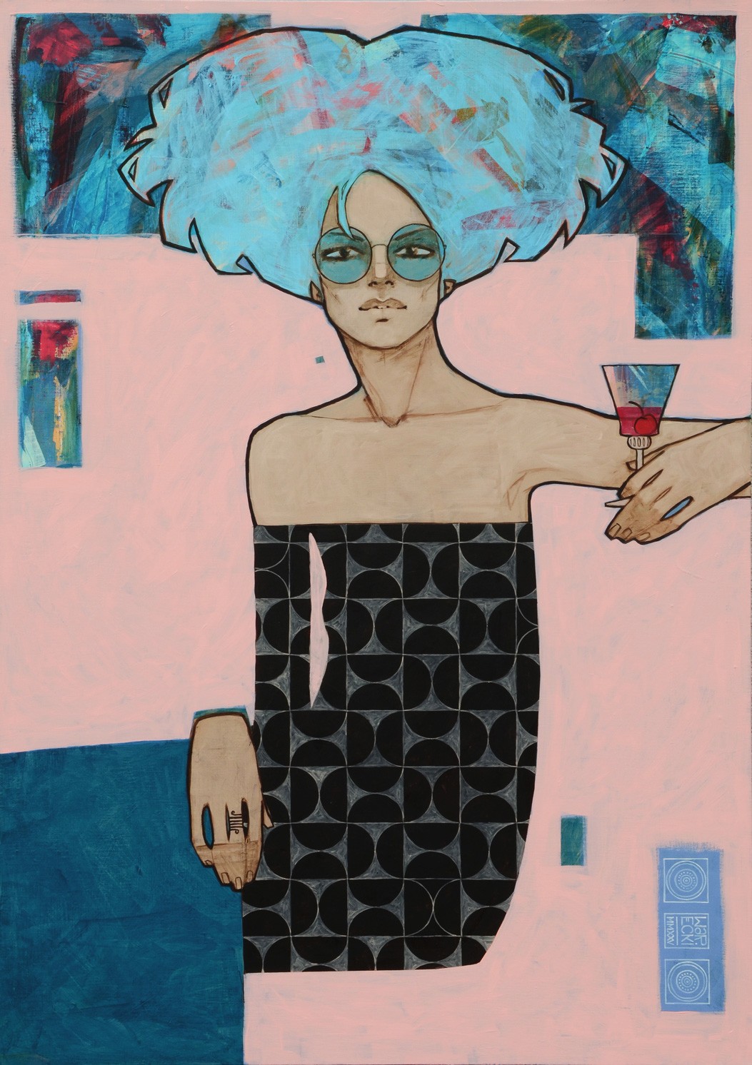 “Okularnica (dama z wisienką)” jest esencją neoklasycznego Pop-artu z nutą retro glamour. Dzieło funkcjonuje jako kapsuła czasu, w której spotyka się estetyka lat 60. i 70. z hiperświadomością współczesnego wizerunku. Kompozycja jest asymetryczna i dynamiczna. Pastelowe różowe tło, przypominające dekorację wnętrza z epoki, jest przerywane przez geometryczny wzór czarno-szarej sukienki i ostry, niebieski impast włosów. Kontur postaci jest graficzny i zdecydowany, co nadaje postaci siłę plakatu. Wzrok postaci, choć przesłonięty dużymi, okrągłymi okularami, wciąga widza w grę tajemnicy i dystansu.
