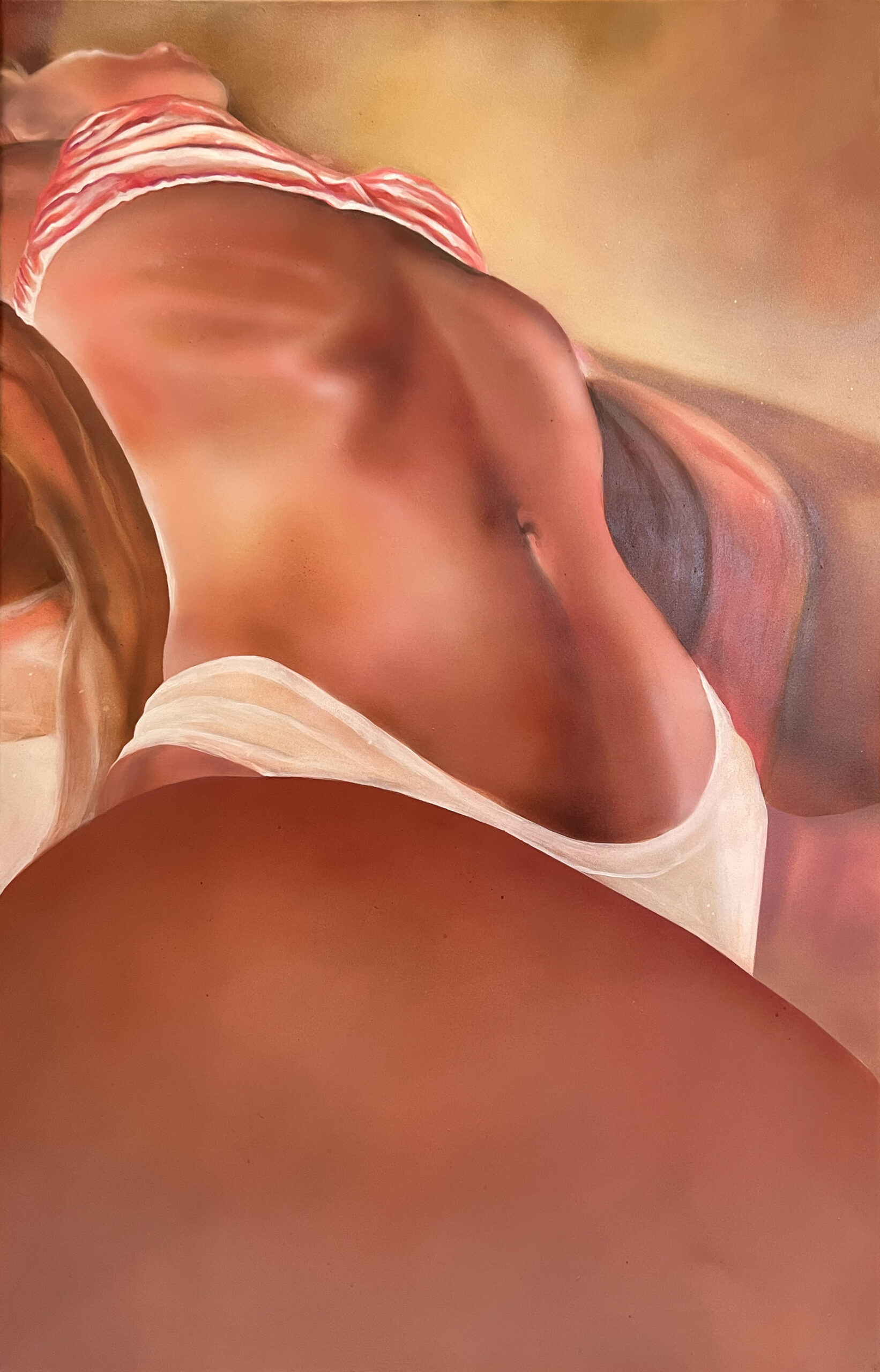 Sztuka współczesna, a zwłaszcza twórczość artystek, dokonała radykalnej rewizji tej tradycji. Portret kobiecy stał się narzędziem odzyskiwania podmiotowości, badania tożsamości i kwestionowania mechanizmów uprzedmiotowienia. Obraz „Bliskość” Oliwii Choroś jest doskonałym przykładem tej strategii. Artystka świadomie wybiera portret fragmentaryczny – radykalne zbliżenie, które eliminuje twarz, czyli najbardziej „tożsamościowy” element klasycznego portretu. Zamiast odpowiedzi na pytanie „kim ona jest?”, Choroś stawia pytanie „czym ona jest?” w sensie fizycznym.