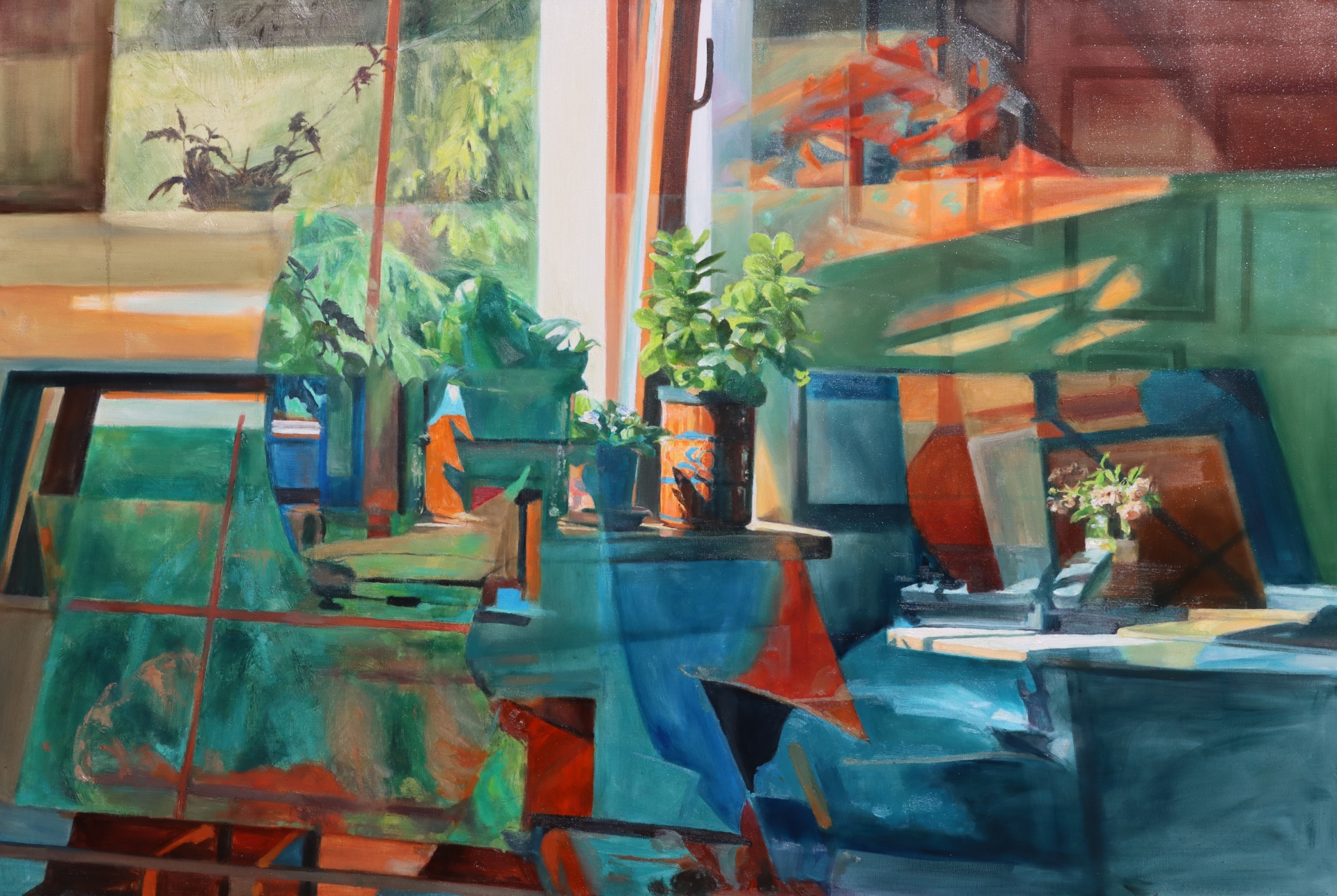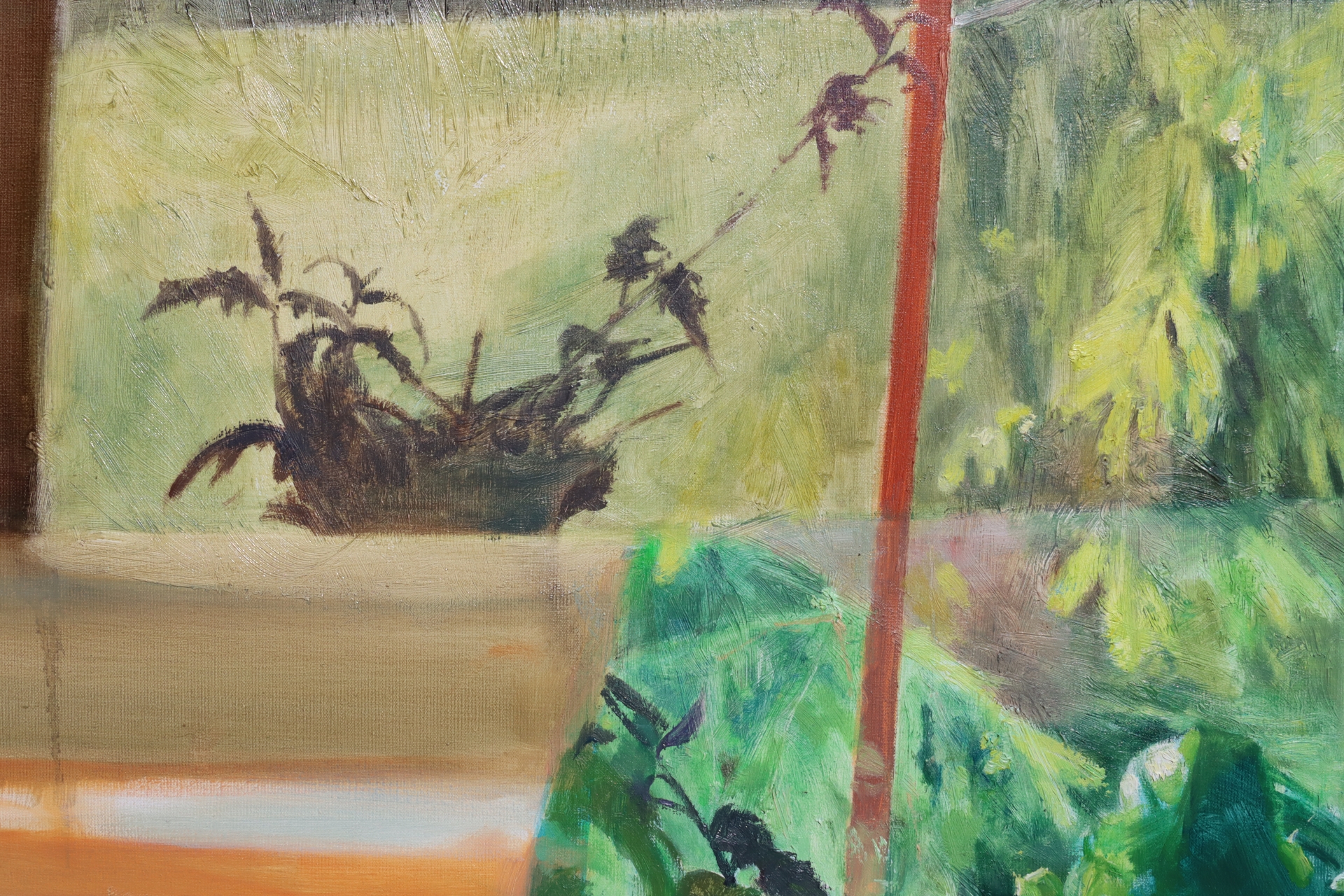 W obrazie „Kompozycja z uchylonym oknem” Oliwka Strzopa zaprasza nas do świata, w którym granica między tym, co prywatne a zewnętrzne, ulega malarskiemu rozmyciu. Artystka z dużą swo-bodą operuje motywem okna – klasycznym symbolem tęsknoty i otwarcia. Zamiast jednak dosłow-nego widoku, otrzymujemy gęstą, oniryczną strukturę, w której rośliny zdają się współistnieć z od-biciami architektury i plamami czystego koloru.