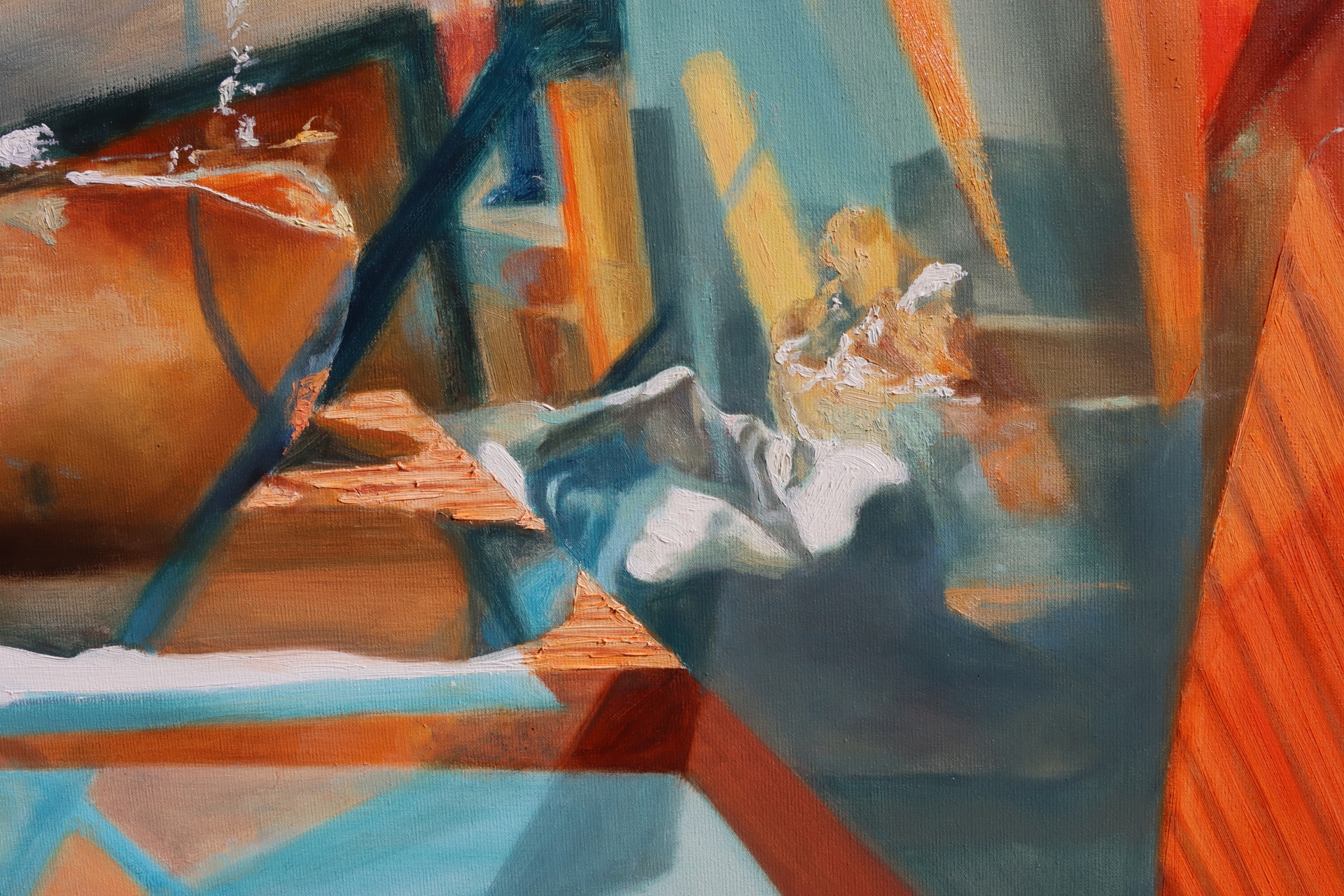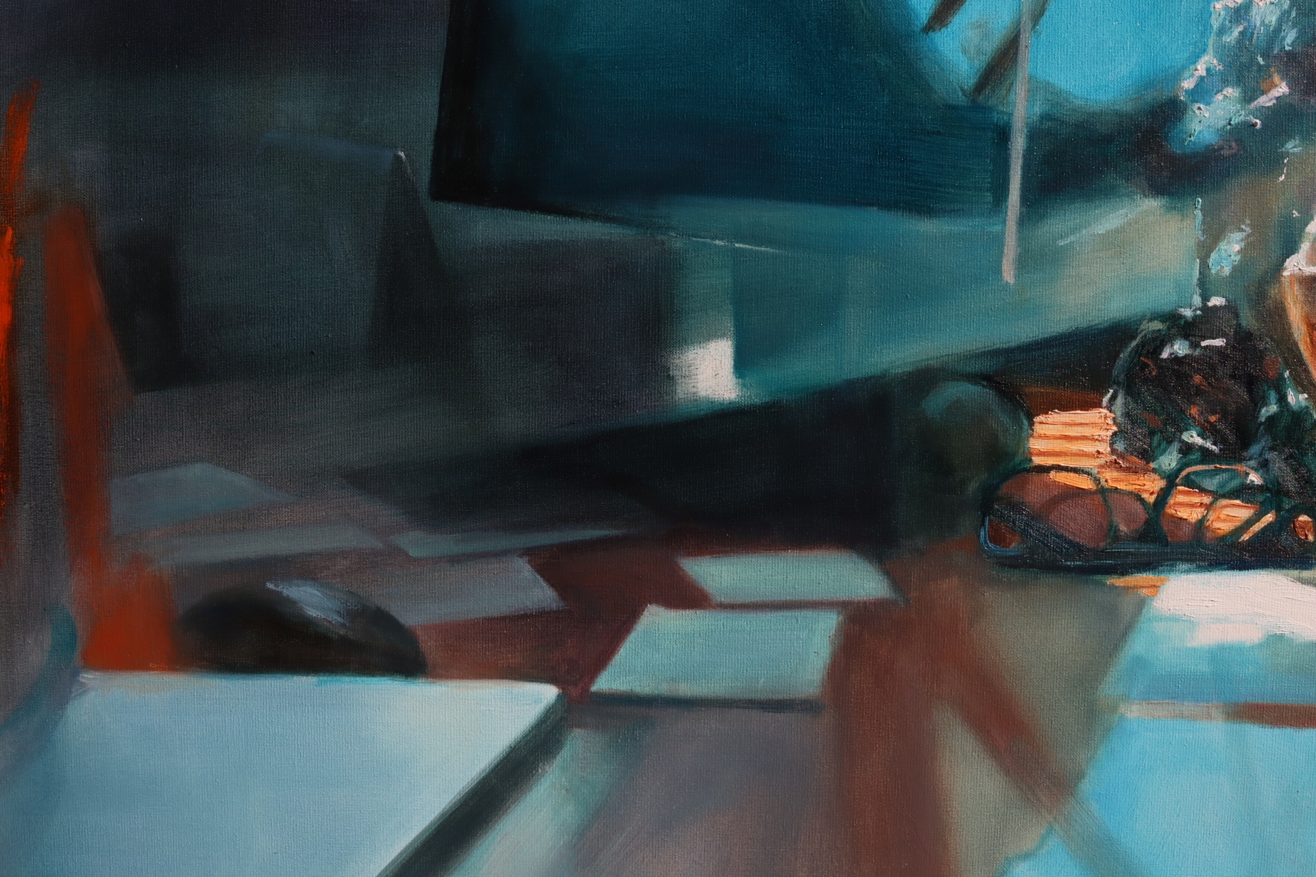 Obraz „Martwa natura z monitorem” to bardzo ciekwae i udane studium światłocieniowe fragmentu pracowni, w którym Oliwka Strzopa dokonuje analizy geometrii współczesnego otoczenia. Pod względem formalnym praca opiera się na diagonalnej konstrukcji kompozycyjnej, gdzie linie wyznaczone przez krawędź biurka, monitora oraz kąt padania promieni słonecznych przecinają płótno, tworząc dynamiczną siatkę podziałów. Artystka stosuje syntezę formy, upraszczając detale przedmiotów na rzecz uwypuklenia ich brył w silnym kontraście walorowym.