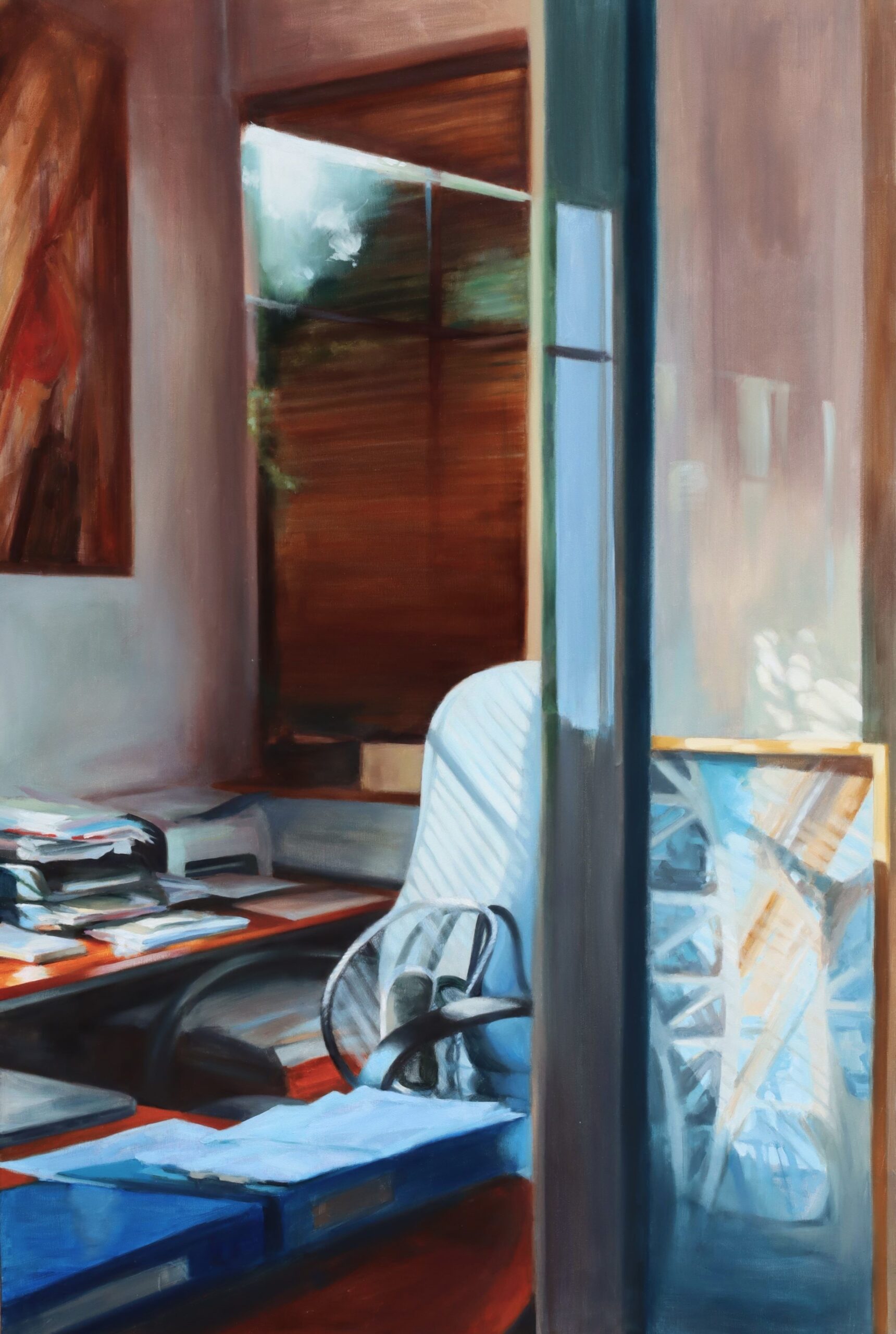 W sztuce współczesnej studia światła i wnętrza (jak u Strzopy) są często wykorzystywane jako pretekst do wyrażenia stanów psychologicznych. Zmieniające się światło, w cyklu „Podwójne okno”, staje się symbolicznym zegarem emocji i rytmu życia – od porannej dynamiki po popołudniowy relaks. W tym obrazie, nieożywione przedmioty (martwa natura) – pusty fotel, teczki, stosy dokumentów – są kluczowe, ale ich funkcja jest minimalna.