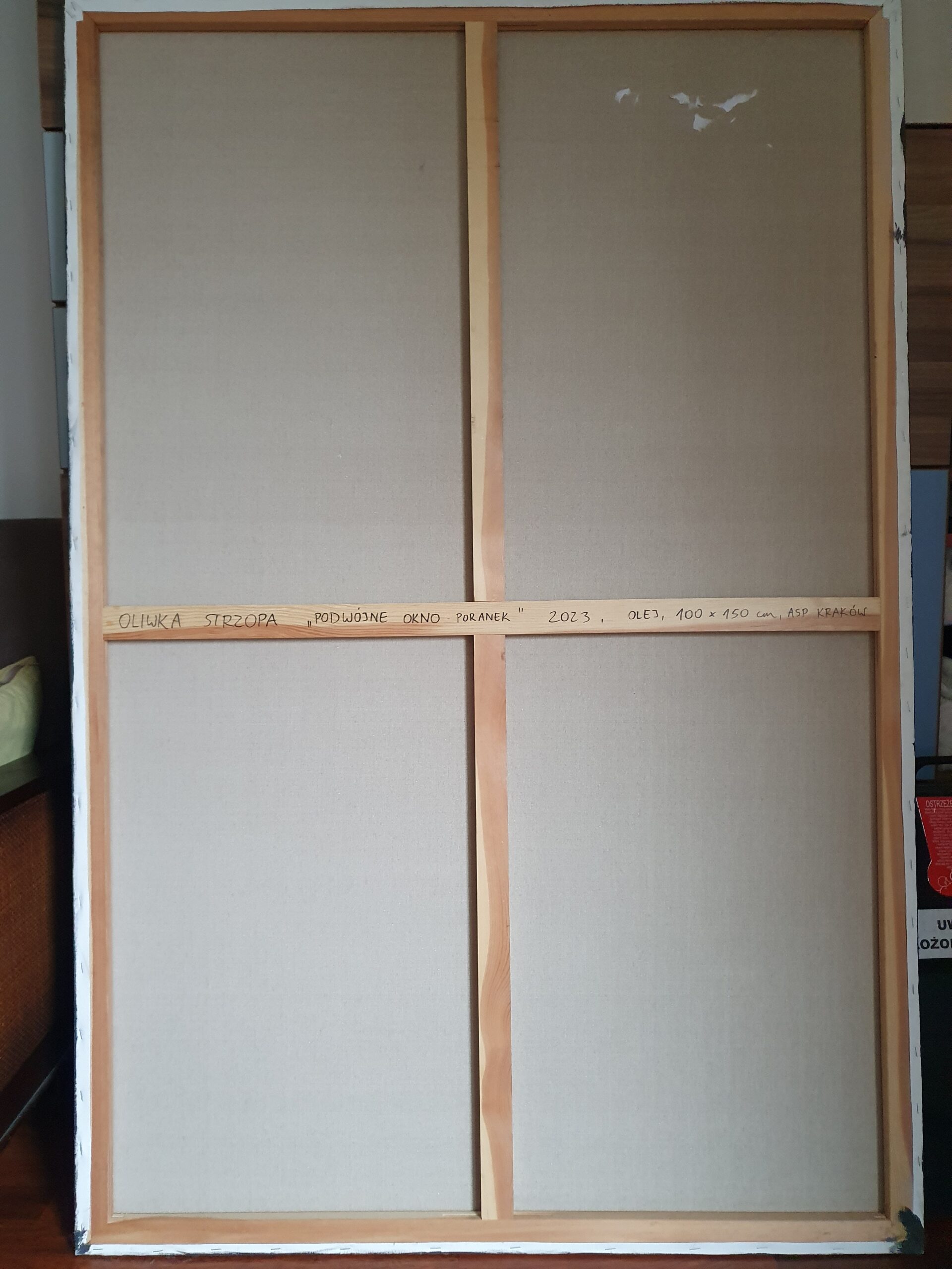 Wstęp: „Podwójne okno II (poranek)” (2023) jest kontynuacją tematyczną i formalną mini cyklu rozpoczętego przez obraz „Podwójne okno I (popołudnie)”. Płótno o wymiarach 100×150 cm, również wykonane techniką farby olejnej, przedstawia to samo wnętrze, ale uchwycone w radykalnie odmiennych warunkach świetlnych i kompozycyjnych. Obraz ten jest studium światła porannego w kontrze do ciepłej, popołudniowej scenerii.