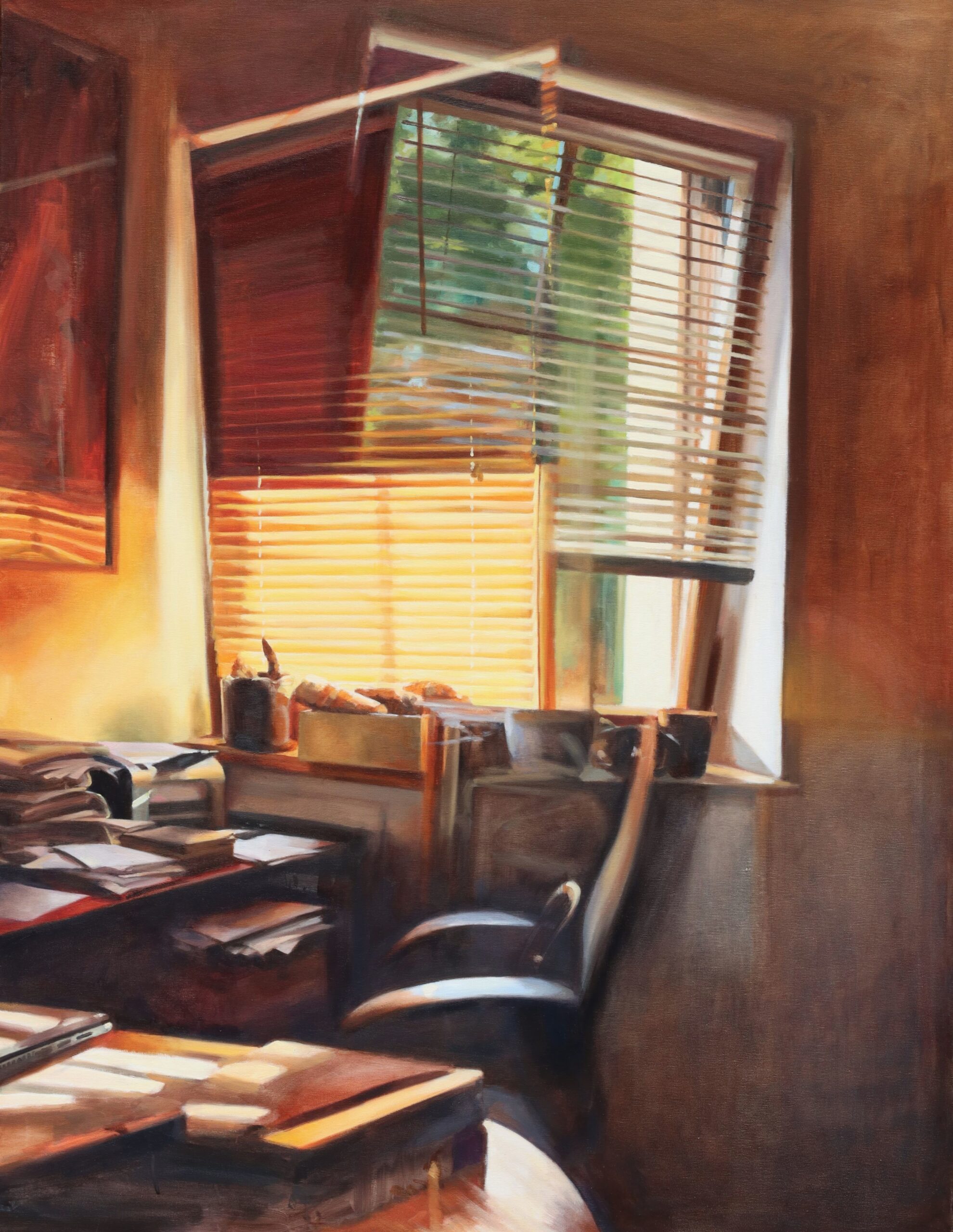 Kompozycja: Kompozycja jest dynamiczna pomimo statycznego tematu. Dominuje tu silna linia diagonalna wyznaczona przez krawędź biurka i krzesła oraz stół w lewym dolnym rogu. Te elementy prowadzą wzrok od ciemnego pierwszego planu ku jasnemu, centralnemu punktowi – podwójnemu oknu z opuszczonymi żaluzjami. Całość opiera się na kontraście tonalnym między ciemnymi, cie-płymi brązami i ugrami wnętrza a oślepiającą, złocistą poświatą światła.