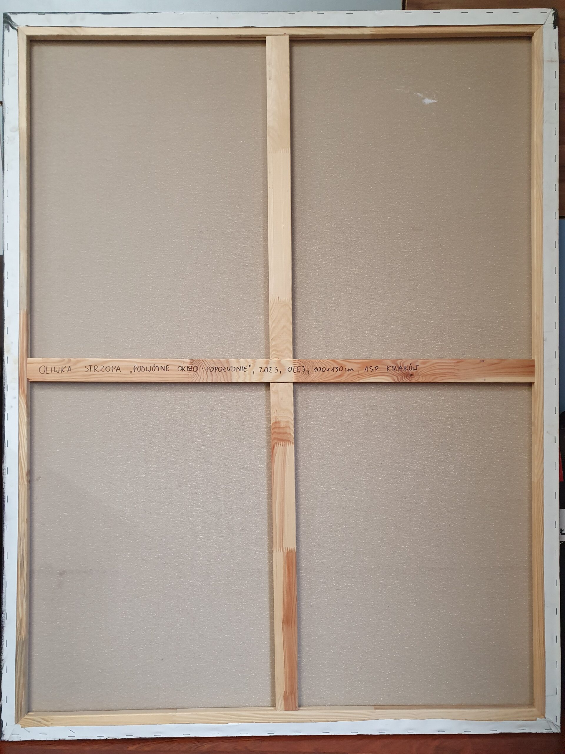 Wstęp: „Podwójne okno I (popołudnie)” (2023) to przykład współczesnego realizmu autorstwa Oliwki Strzopy, obrazujący intymną scenę wnętrza. Płótno o wymiarach 100×130 cm, wykonane techniką farby olejnej, przedstawia fragment biura lub pracowni skąpanego w ciepłym, popołudniowym świetle słonecznym.