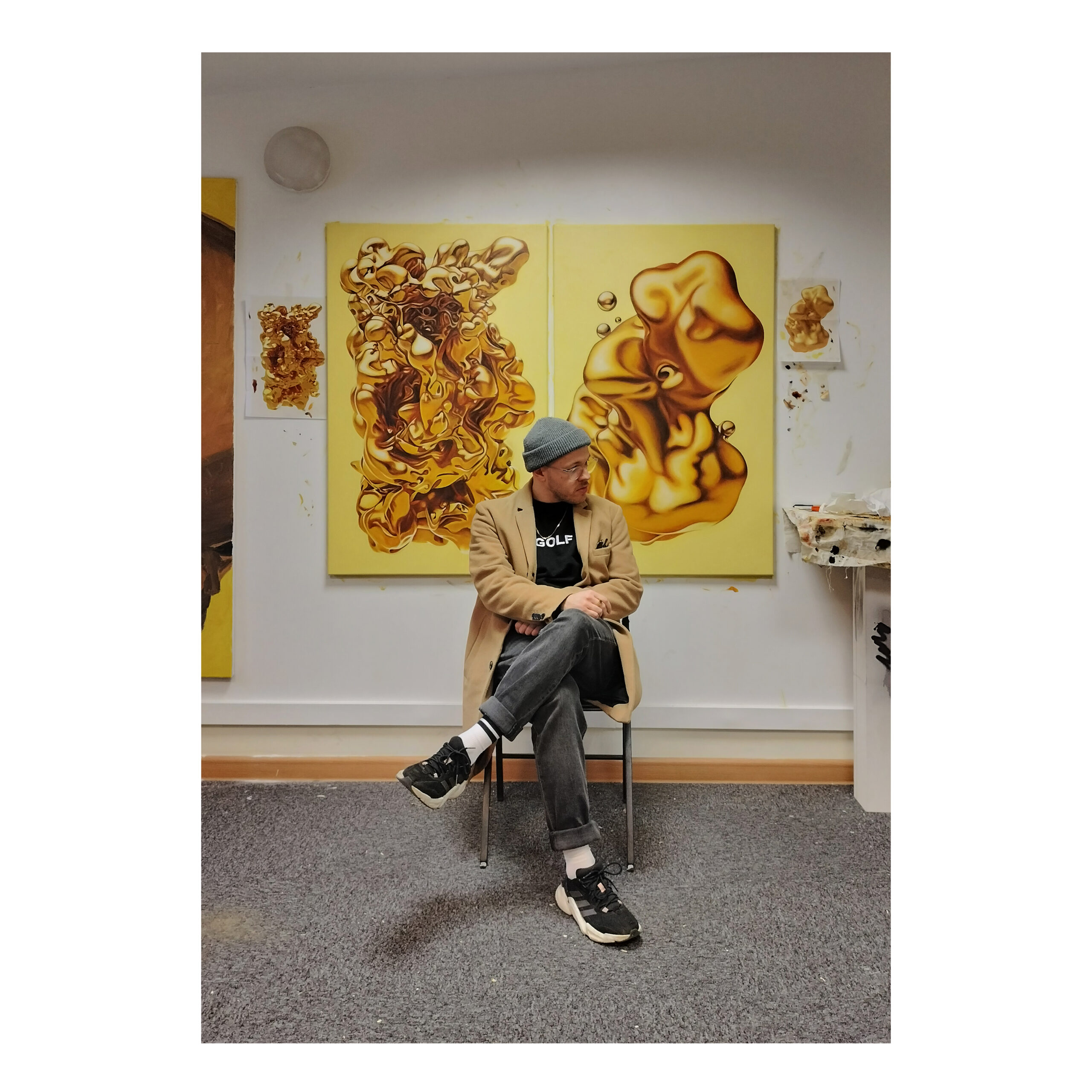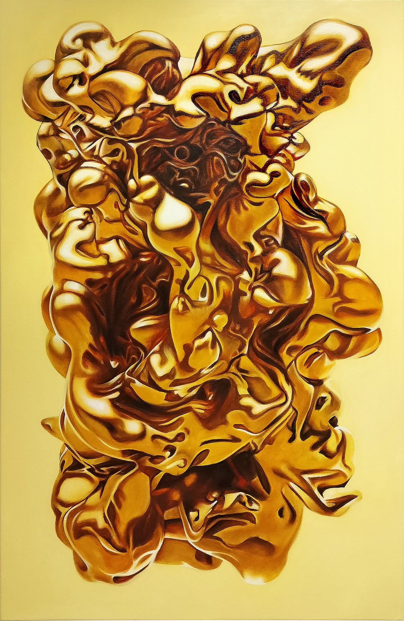 W AI Gold 2, drugiej odsłonie dwuobrazowego cyklu Pawła Franciszka Jaskuły, artysta eskaluje swoje rozważania nad naturą wartości, prowadząc widza w głąb hipnotyzującej i zarazem niepokojącej struktury. Jeśli AI Gold 1 było narodzinami idei – biomorficznym, wyizolowanym kształtem – tak AI Gold 2 jest jej gwałtowną, niemal barokową erupcją. Forma, choć wciąż płynna i złota, utraciła swoją względną prostotę na rzecz skomplikowanej, konwulsyjnej struktury. Obserwujemy masę, która kłębi się, pęcznieje i zapada w sobie, tworząc labirynt lśniących powierzchni, głębokich szczelin i mrocznych zakamarków.
