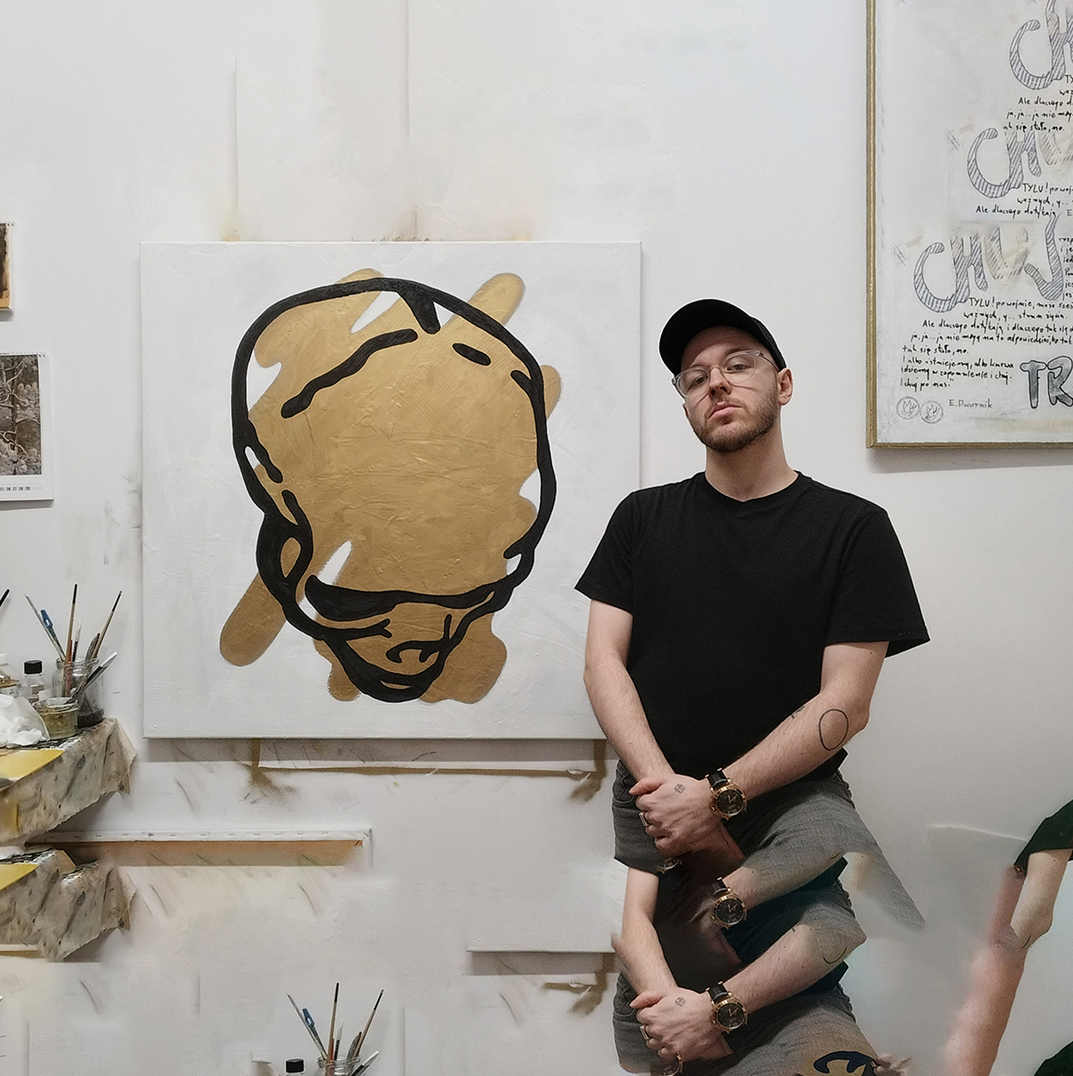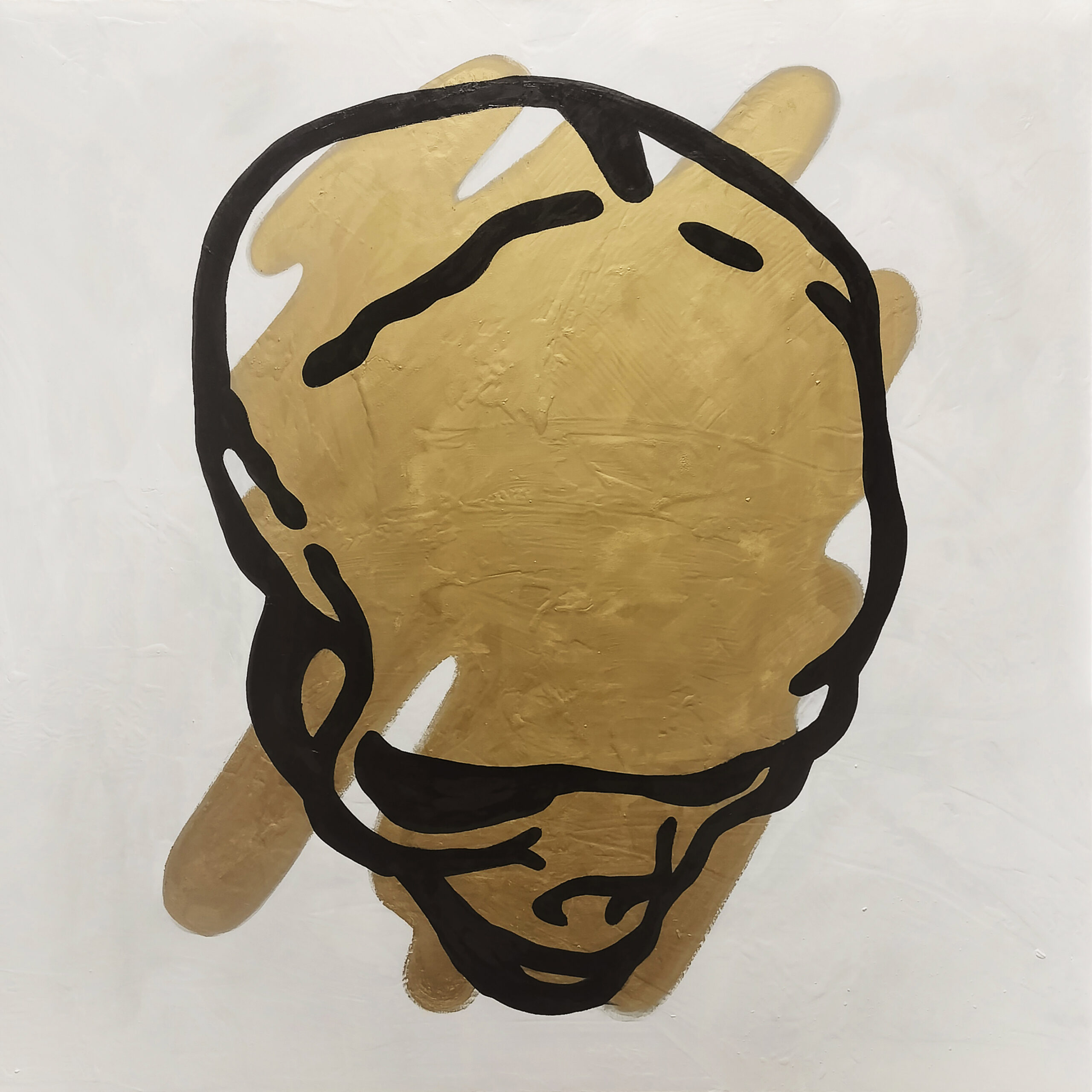 Tam, gdzie w LSD znaleźliśmy hiperrealistyczną precyzję i intelektualny ciężar historycznych inskrypcji, tutaj Jaskuła posługuje się językiem graficznego skrótu. Gruba, komiksowa kreska redukuje czaszkę do piktogramu, uniwersalnego logo śmierci, które mogłoby funkcjonować w przestrzeni pop-artu. To celowy zabieg, który odziera symbol memento mori z jego klasycznego patosu i umieszcza go we współczesnym kontekście wizualnym. Zamiast iluzji lśniącego metalu, złoto jest tu fizyczną, niemal brutalną obecnością – gestem malarskim, grubą warstwą farby nałożoną na płótno.