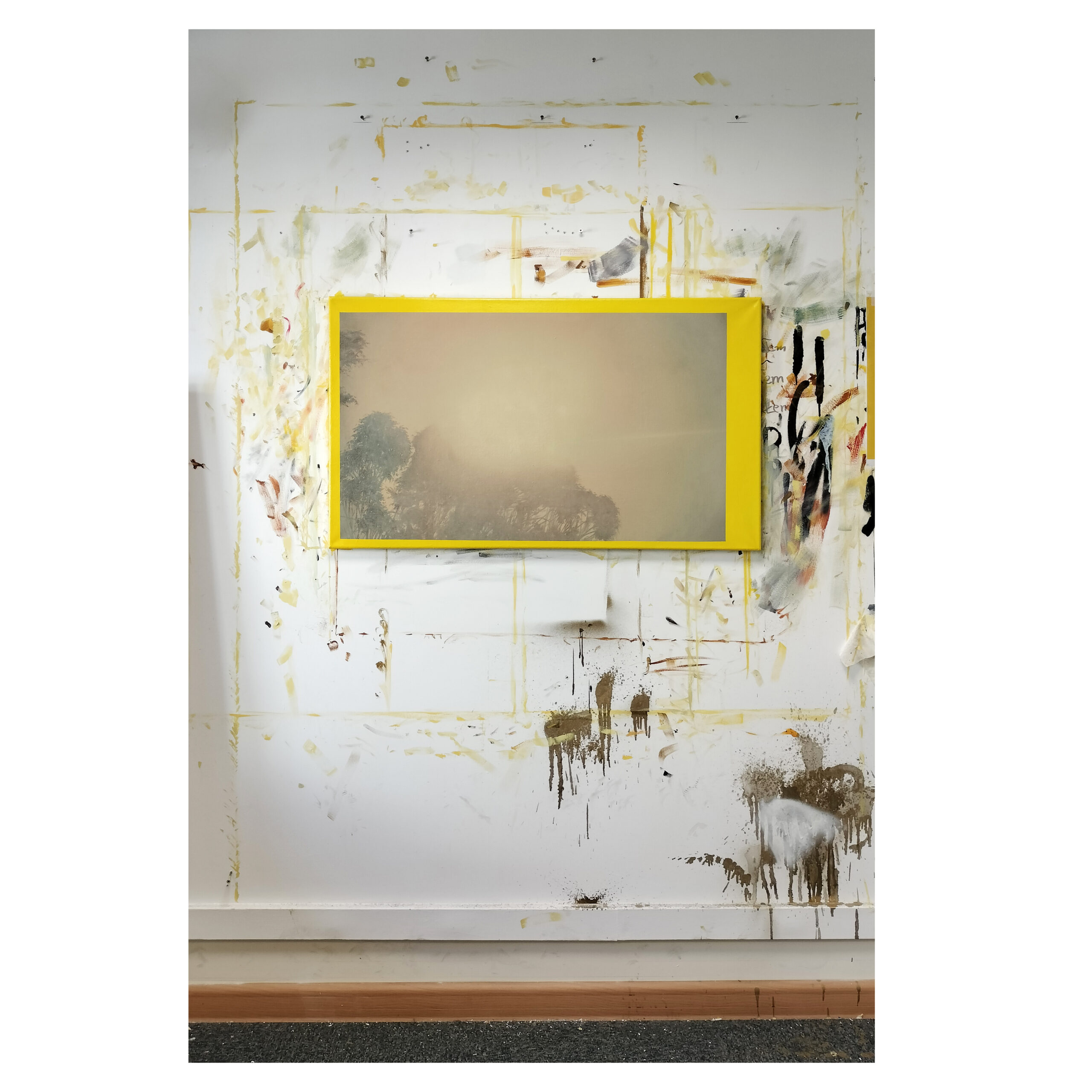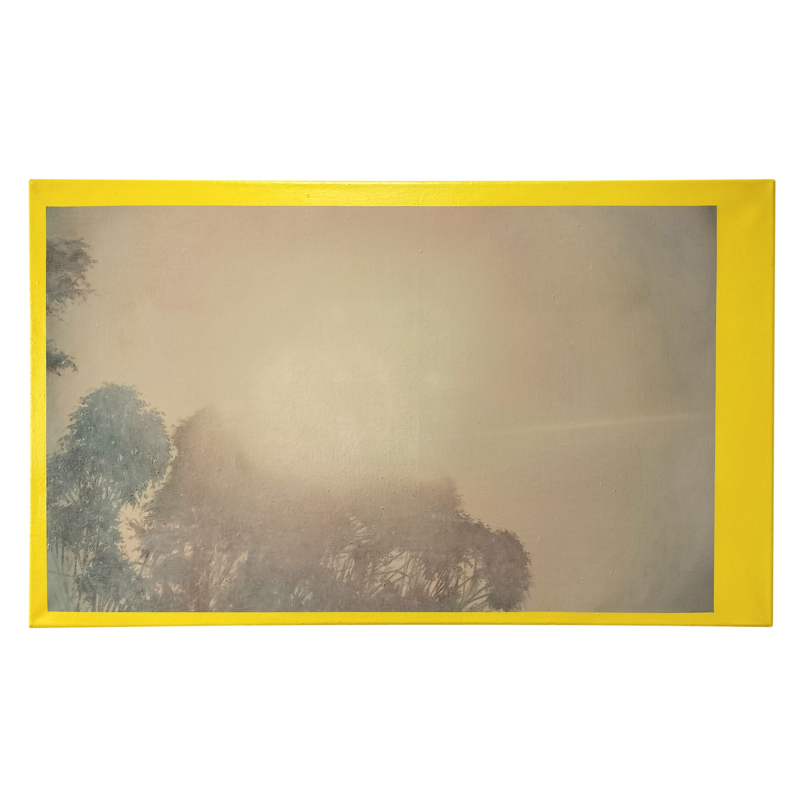 1. Paleta obrazu jest celowo rozdarta na dwie odrębne gamy: subtelną i zgaszoną paletę atmosferycznego pejzażu oraz pojedynczy, agresywny kolor sztucznej „ramy”, 2. Biel i szarości: Użyte do stworzenia efektu mglistego, oślepiającego światła, które dominuje w kompozycji, 3. Zgaszone, rozmyte zielenie: Widoczne w partiach drzew, kolory te są mocno złamane bielą i szarością, co sprawia, że formy roślinne zdają się rozpływać w świetle, 4. Beże i ugry: Delikatne, ciepłe tony w tle, które sugerują barwę nieba lub ziemi przefiltrowaną przez gęstą atmosferę, 5. Żółcień cytrynowa: Użyta w czystej, niemal przemysłowej postaci do namalowania płaskiej, asymetrycznej ramy. Jej intensywność i sztuczność ostro kontrastuje ze stonowaną paletą pejzażu.