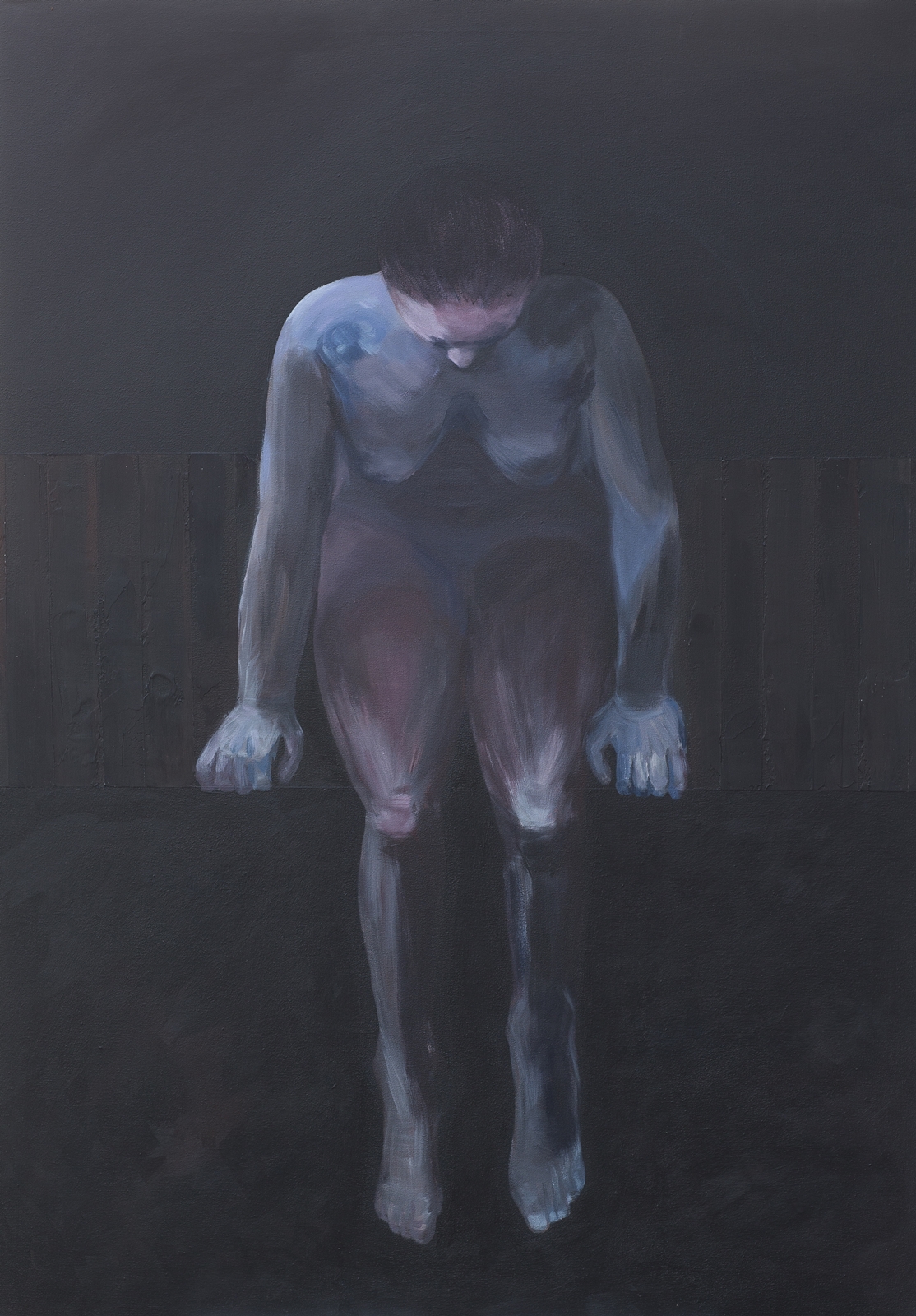 1. PALETA BARWNA obrazu jest bardzo wąska i zredukowana do minimum, 2. Dominującym kolorem jest zdecydowanie CIEMNY SZARY / GRAFIT WPADAJACY W CZERNIE I CIEMNE GRANATY. Pokrywa on tło, tworząc jednolitą, ciemną powierzchnię, na której wyróżnia się jaśniejsza postać, 3. Kolejnym ważnym kolorem jest JASNY SZARY/SREBRNY, użyty do namalowania ciała kobiety. Artystka operuje szeroką gamą szarości, modelując figurę poprzez subtelne cieniowanie, 4. Na skórze modelki widoczne są DELIKATNE AKCENTY BŁĘKITU, RÓŻU i FIOLETU. Te subtelne kolory ożywiają skórę, dodając jej realizmu i delikatności
