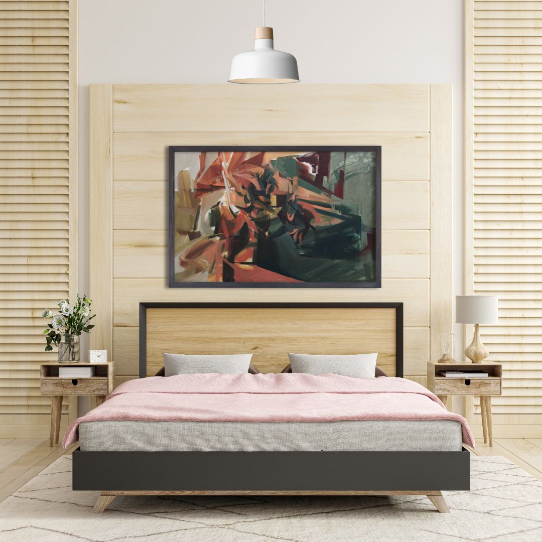 Prezentowany obraz Wiktorii Kuczewskiej to dynamiczna i ekspresyjna kompozycja abstrakcyjna, która angażuje widza poprzez złożoną grę form, linii i barw. Brak jednoznacznego tematu narracyjnego pozwala na swobodną interpretację i osobiste odczucia.