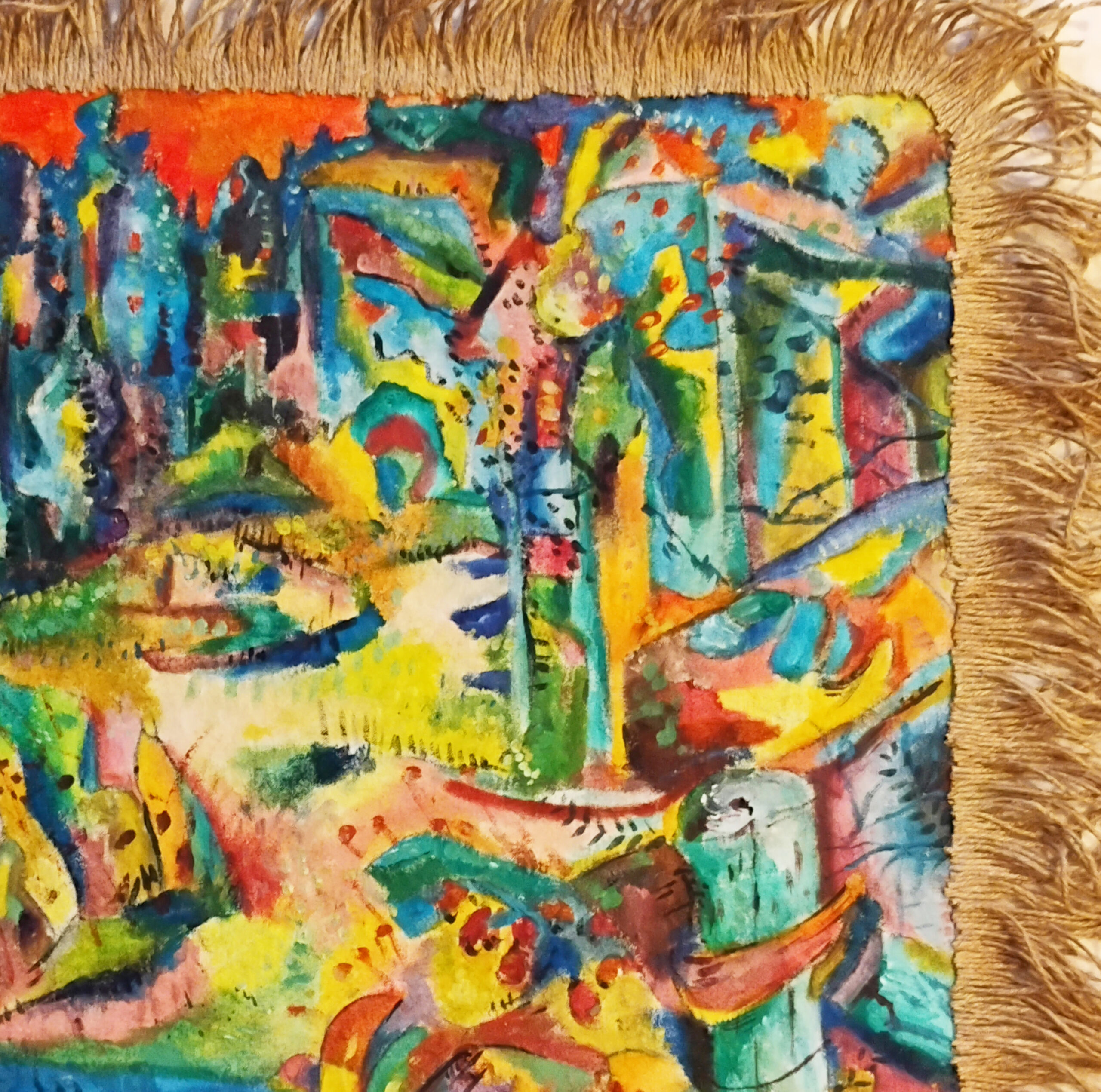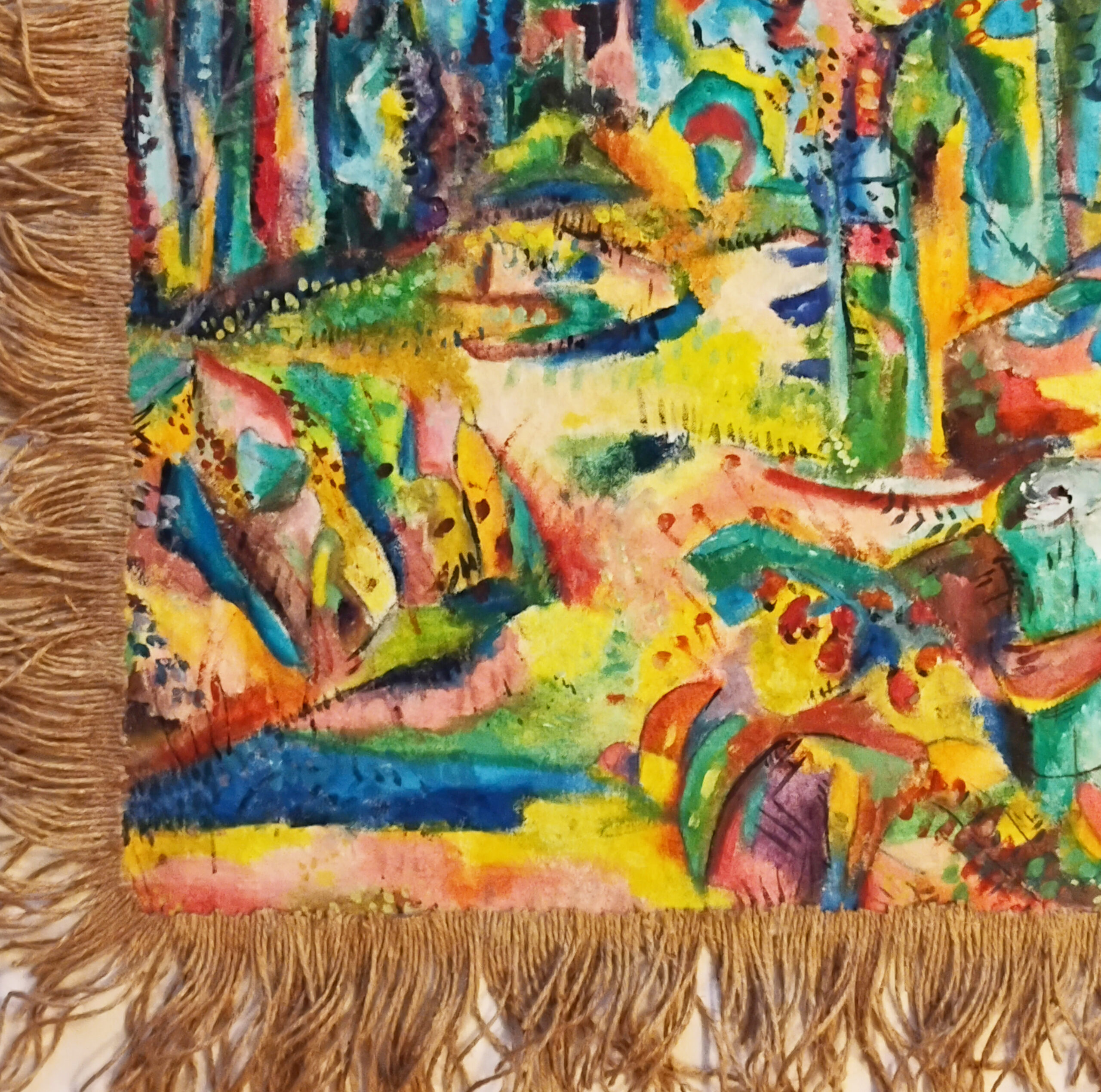 Fincek, stosując wibrującą, niemal fowistyczną paletę barw, rozkłada pejzaż na dynamiczne, przenikające się plamy koloru. Drzewa, polany i niebo tracą swoje materialne kontury na rzecz pulsującej, malarskiej materii. Kluczowym i niezwykle wymownym gestem jest tu jednak wyjście poza tradycyjną płaszczyznę płótna.