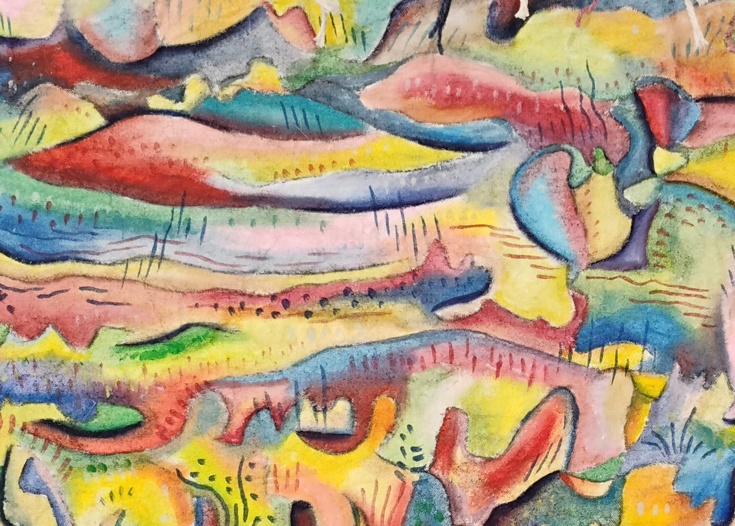 W tej pracy, być może najbardziej lirycznej z całej serii, Fincek odchodzi od dynamicznej ekspresji na rzecz stworzenia płynnej, onirycznej topografii, która zdaje się istnieć na pograniczu jawy i snu. Kompozycja, z jej miękkimi, organicznymi kształtami i rozmytymi, akwarelowymi plamami barwnymi, przywodzi na myśl krajobraz widziany przez zasłonę deszczu, we mgle lub we wspomnieniu.